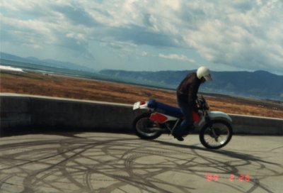 こいつをやるコツとしては、思いっきりのフロント加重で、フロントブレーキをロックさせつつ、アクセルコントロールと、左右へのステップへの加重のかけ方で、まわる方向を決め、フロントブレーキを、わずかづづリリースしながらバランスを取るという....口で言うと簡単そうですが、これがなかなか....... |