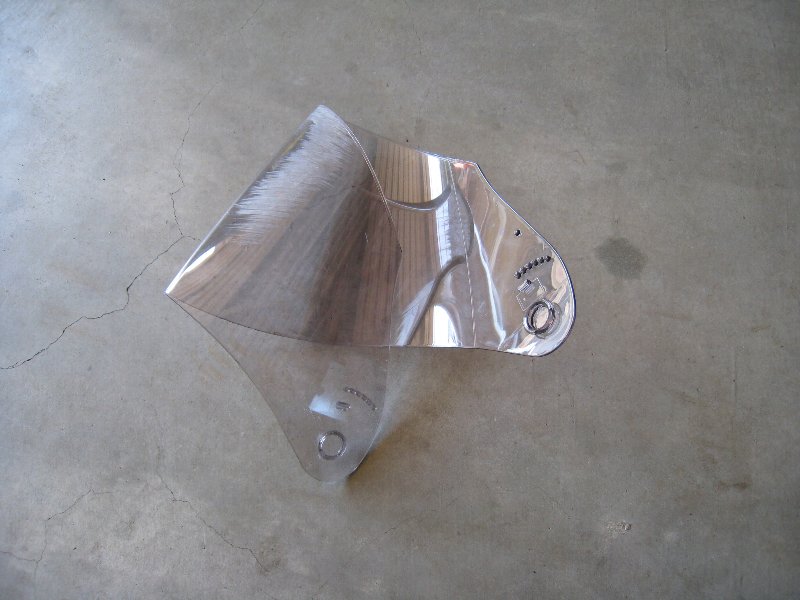 | 路面と接触し、外れて路面に転がり、数分後に通った後続の自動車に轢かれて二つ折りになったシールド。こんな状態なのに、顔には傷一つ有りません。 |