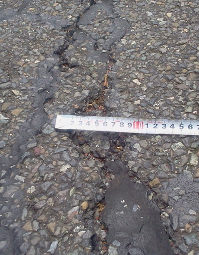 ただし、バイクのタイヤが通るであろうラインから30センチほど外側に、進行方向に3m以上、幅の広い亀裂が走っています。 |