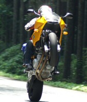借り物です。輸出仕様のVブーストがウィリーをやりにくくしています。クラッチを使いドカンと繋いだ瞬間ホイルスピンしますが、そのまま少し我慢してトラクションを掛けウィリーに持ち込んでみました。ローで上げてセカンドで落ちます。 ●ウィリー特別編 part-1 |