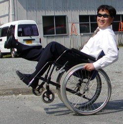 | これは車椅子の後側のフレームに足を載せ、あたかも2人乗りをしているような感じ。形を見ても解りますが重心位置がほとんど車軸上にあるので、コントロール幅が狭く、難しいのですが、難易度の割りには、失敗した時のリスクが少ない技です。(笑) |