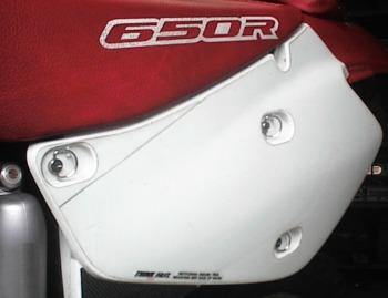 | サイドカバーやフェンダー等が光って見えるのは、クリアの保護用のカッティングシートを貼り付けているため。 傷、汚れからプラスチックパーツを守り、マディーなコンデションの時に泥が付いて重たくなるのを防いでくれますが、なんと言ってもパーツのクオリティーが長持ちし、シートを貼り替えればいつでも新品同様ってのが一番です。 ここでは、そのノウハウを惜しげもなく公開(笑) 写真は全て2001/10/18現在の物です。何故かと言えば、貼り付けてから1年以上が経過し、カッティングシートに入れた切り込みの部分が汚れて、貼り付け具合がよく解るため。 |