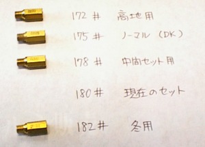 | 本当なら中間域のニードルのクリップ位置も下げたかったのだが、いっぺんにやると訳が分からなくなるので、今回はメインジェットのみを交換。 ノーマル#175 → #180 に2番手アップ セッティング用に172番から182番までメインジェットを一括購入。 サイレンサー交換+ジェッティングを施した後での乗ってみての感想は、低速はそれほど変わらないのだが、低速から中速にかけてのつながりがスムーズになって、中速以上は全体的にトルクが上載せられたような感じで非常に良いフィーリングを持った。いっきにジェットを2番手アップしたが、濃い感じは無く、非常にスムーズ。高速域については、はじける感じで、まさにサイレンサーの抜けが良くなりつつも、低速域では排圧がきいている感じで、乗っての感じは気持ちよいの一言だね。 |