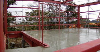 今日はいよいよスラブのコンクリート打ちです。床はカラークリートでの金ゴテ直仕上げなので、雨が降ると最悪。仕上げる事が出来なくなるので、なんとか雨が降らないように祈ります。