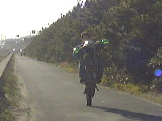 本田くんの愛車、KLX250改・280を借りてのウィリーです。
