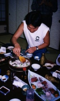 晩飯は民宿「稲林」で、船盛りあり、煮付け有り、